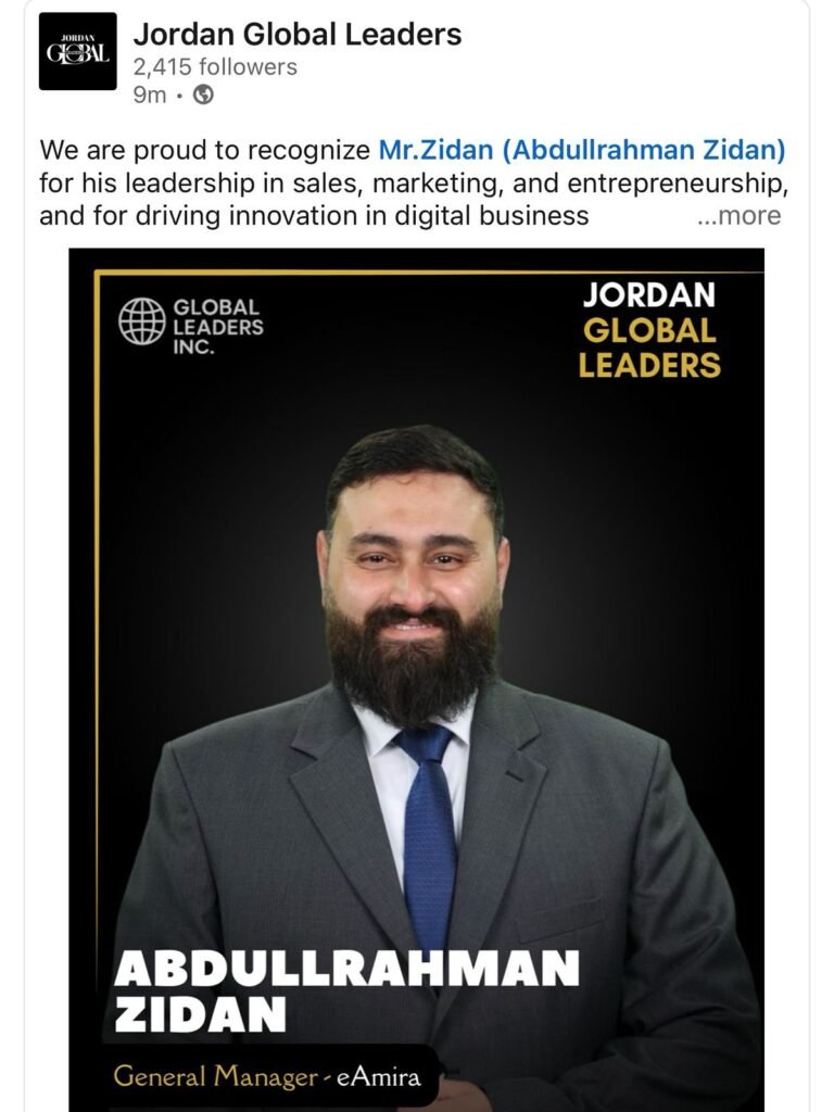اختارت Jordan Global Leaders عبدالرحمن زيدان تقديراً لإنجازاته المهنية، وتأثيره الإيجابي في تطوير قطاع التسويق والمبيعات في الأردن، مما يعكس قيم الابتكار والتميز، ويضعه في طليعة القادة القادرين على قيادة الجيل القادم من المتخصصين في المملكة.